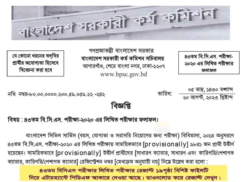 Bangladesh Public Service BPSC has published 43rd BCS written exam result on 20 August 2023. Total 9,841 candidates has been selected for viva voce. The written exam was taken in July 2022.