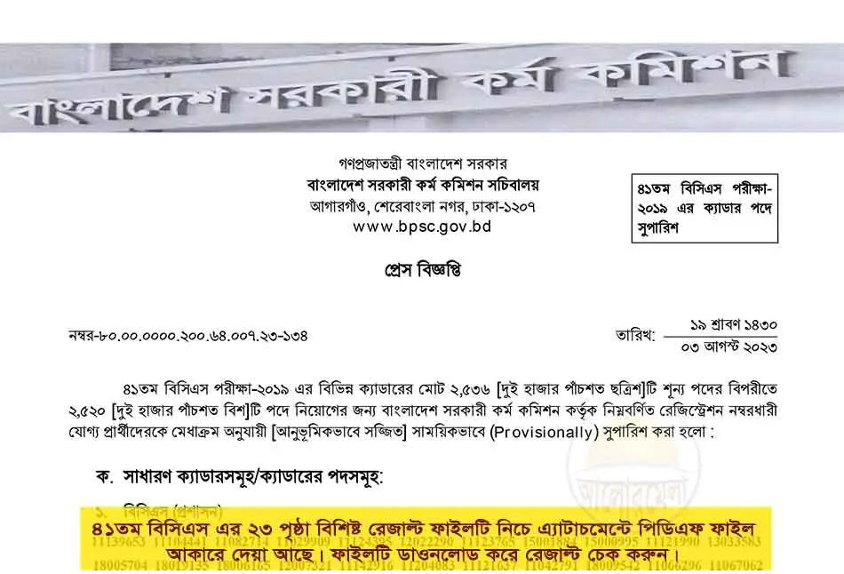 41th BCS final result: 41th BCS final result was published in 03 August 2023. Total 2,520 candidates has been requested to join as cadre. The BPSC also published 9,821 candidates list and many non-cadre will be appointed among them