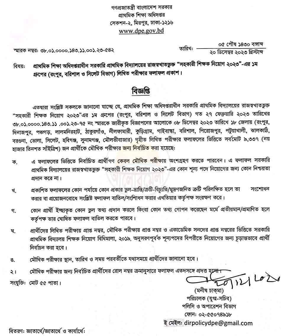 1st Phase result: Primary school assistant teacher recruitment exam 1st phase result has been published on 20 December 2023. Passed 9,337 candidates.