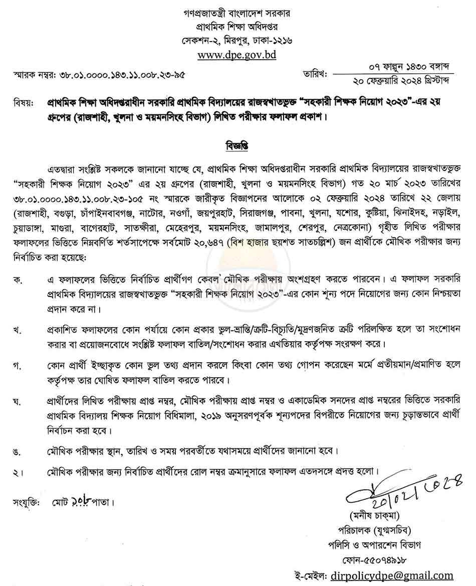 Director general Mr. Shah Rezuan Hayat had confirmed that the primary assistant teacher recruitment exam 1st phase result can be published on December 2023, 2nd phase on 20 February and 3rd phase on 21 April 2024.