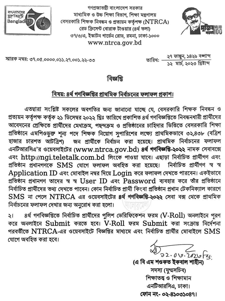 Non-government Teacher's Registration and Certificate Authority has published 4th public e-Application result on 12 March 2023 and 32,438 applicants initially selected to join as school and college teacher. The NTRCA will recruit 68,390 school and college teachers among them who has NTRCA certificates. The 4th public e-Application already done on 29 January 2023.