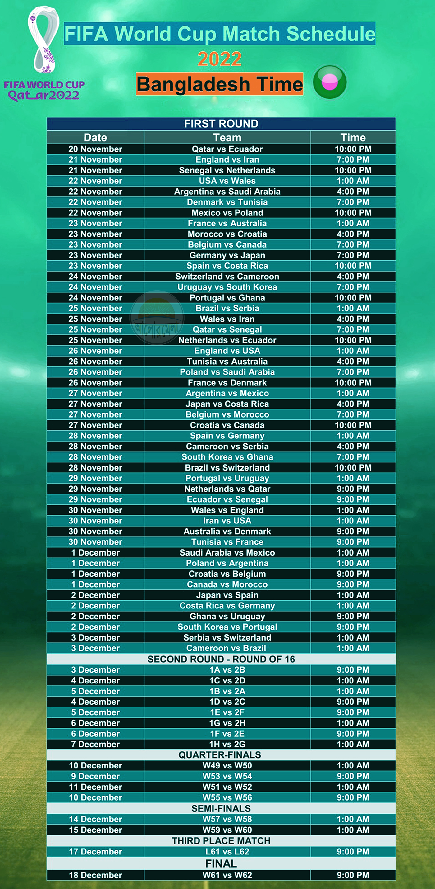 The World Cup Football 2022 schedule is created according to Bangladesh (Dhaka) GMT +6 time zone. Click on the picture to download it as high resulation file. You can get it as HD file from the below under attachment.